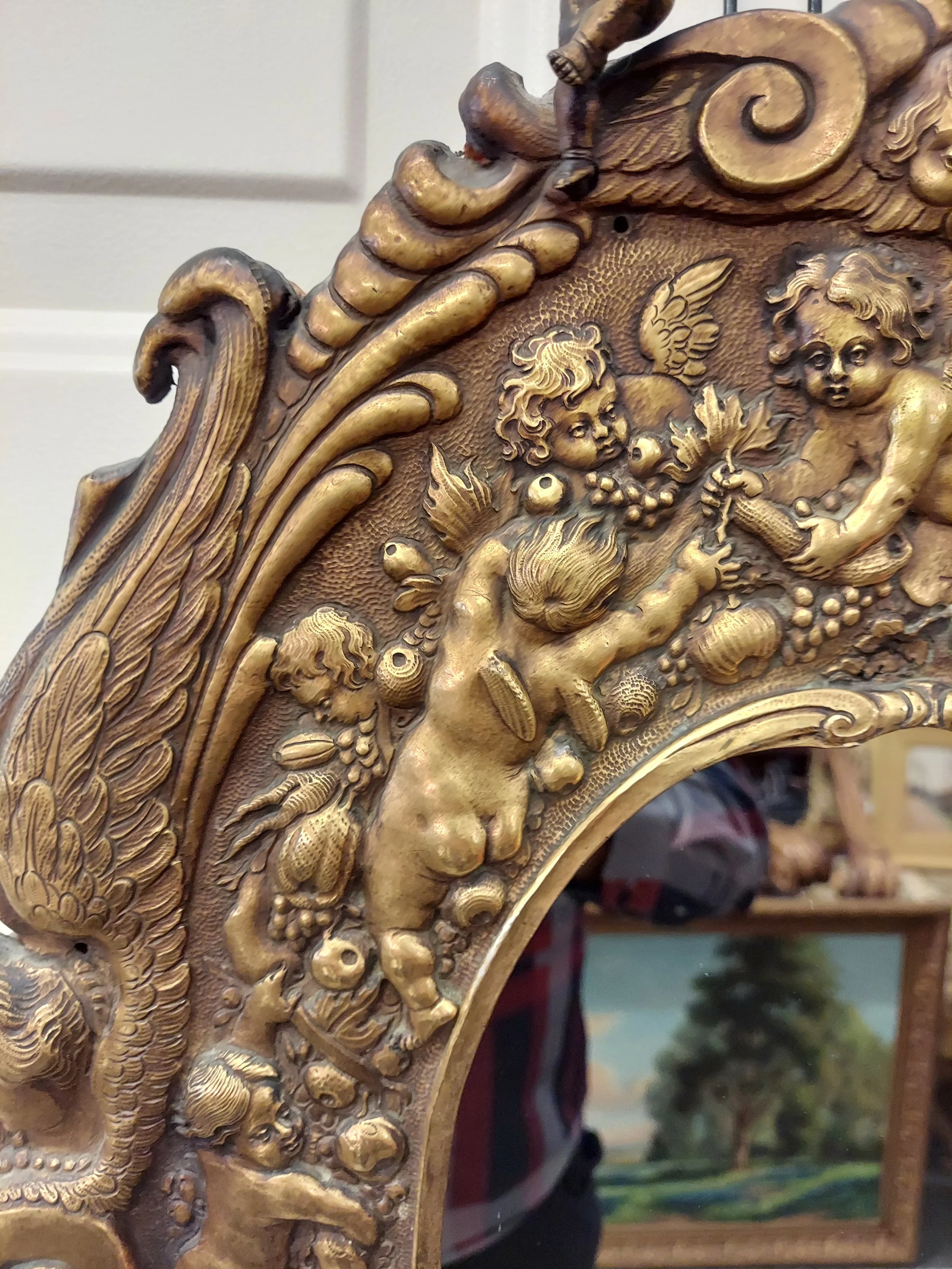 It is in beautiful antique condition as you can see by the photos. Beautifully designed with cherubs or puttis all around with what appears to be a family crest at the topp. The last photo shiows that it has a small repair holding the putti to the rest of the frame.